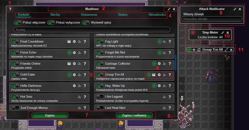 - Aktywny / nieaktywny - tymczasowo włącza / wyłącza funkcjonalność dodatku, bez konieczności odświeżania gry.